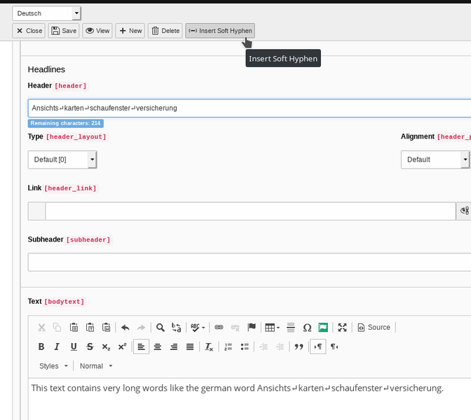 Wie die Softhyphen eingebunden werden, ist im Bild zu sehen. Setzen Sie einfach Ihren Cursor an die gewünschte Stelle und drücken Sie die "Insert Soft Hyphen" Schaltfläche.